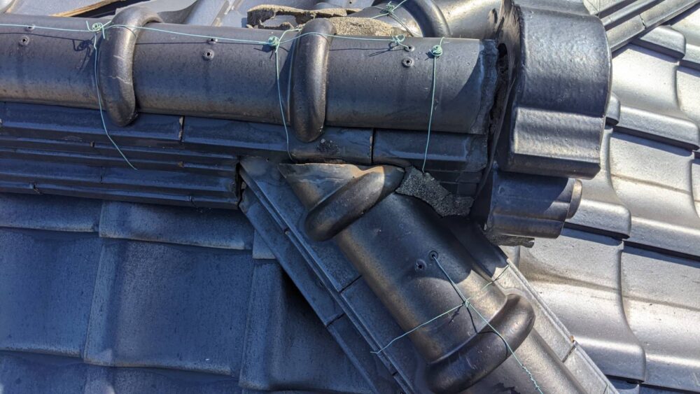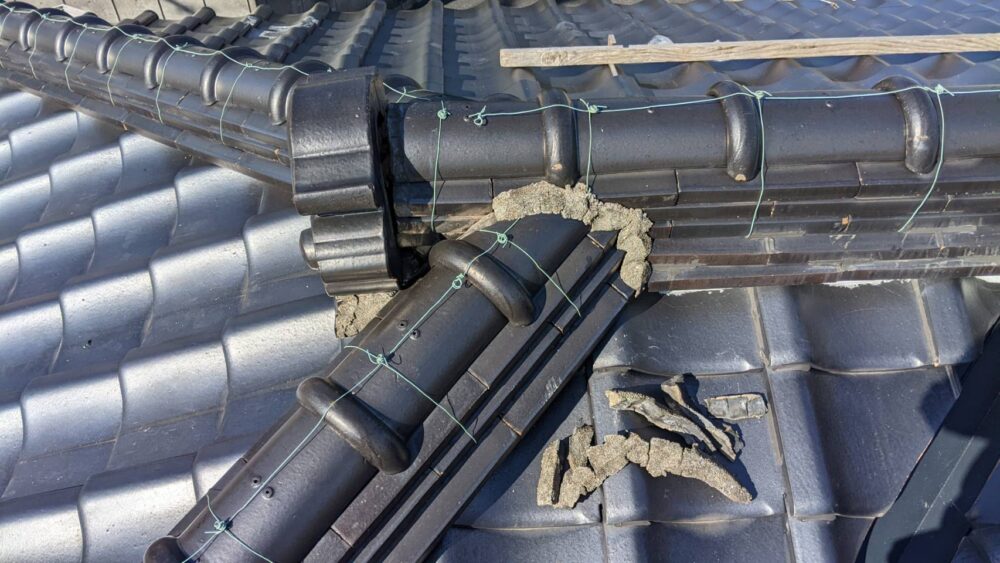 現地調査を行ったところ、**棟瓦のジョイント部(接合部)**の漆喰が経年劣化でひび割れ・欠落していました。