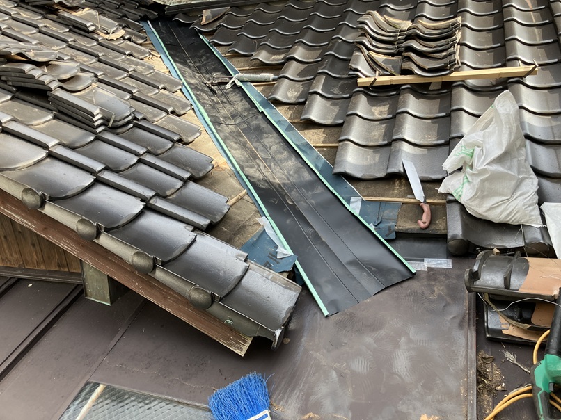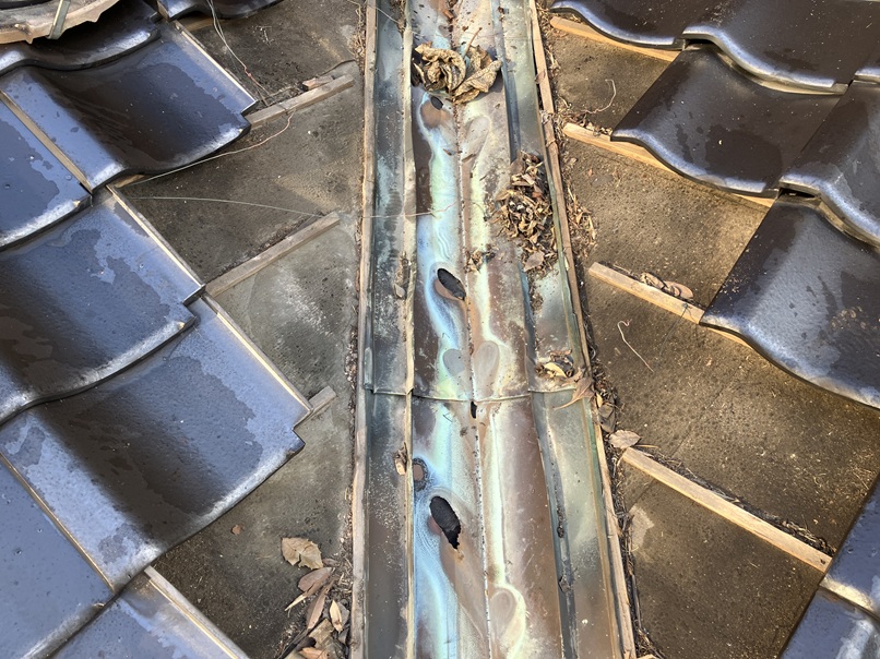 「銅板の谷板金に穴があき雨漏りしていたため、耐久性の高いカラーステンの谷板金へ交換し、雨漏りをしっかり解消しました。下関市で谷板金の劣化や雨漏りでお困りの方は、ライフへご相談ください。」