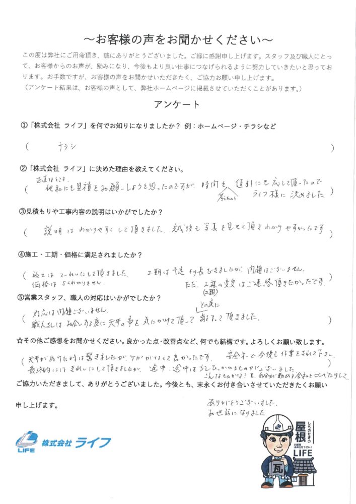 【山口県下関市】雨漏り修繕工事のお客様の声です。ぜひ、ご覧になってください。